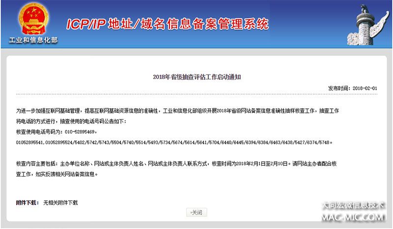 工信部關(guān)于2018年ICP備案信息抽樣核查通知