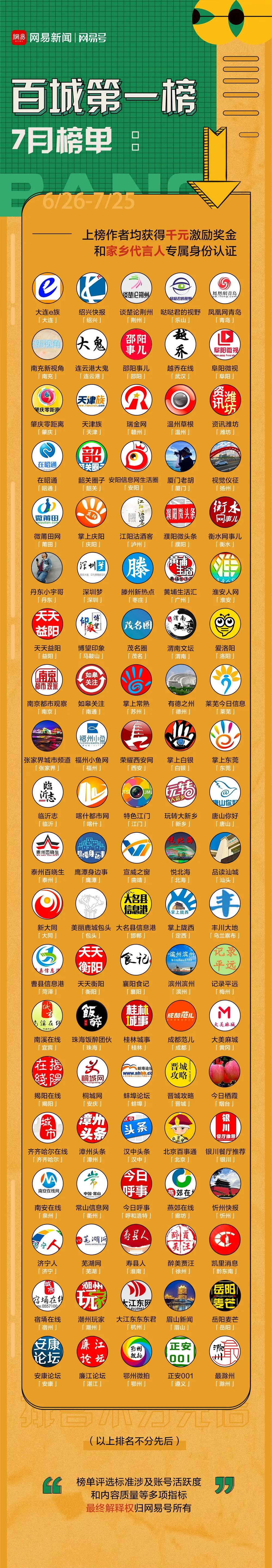 網(wǎng)易號“尋找家鄉(xiāng)代言人”系列扶持計劃之百城第一榜,旨在獎勵為用戶提供多元化本地內(nèi)容的優(yōu)質(zhì)本地作者。升級版“百城第一榜”專注于扶持創(chuàng)作方向為本地吃喝玩樂、本地社會熱點、本地人文歷史的自媒體作者。榜單根據(jù)本地作者的發(fā)文數(shù)量、發(fā)文質(zhì)量、原創(chuàng)度、活躍度和互動等多重數(shù)據(jù)表現(xiàn)進(jìn)行評選。上榜賬號可獲得千元現(xiàn)金獎勵、“家鄉(xiāng)代言人”專屬身份認(rèn)證和運營一對一發(fā)文指導(dǎo)等多項福利。