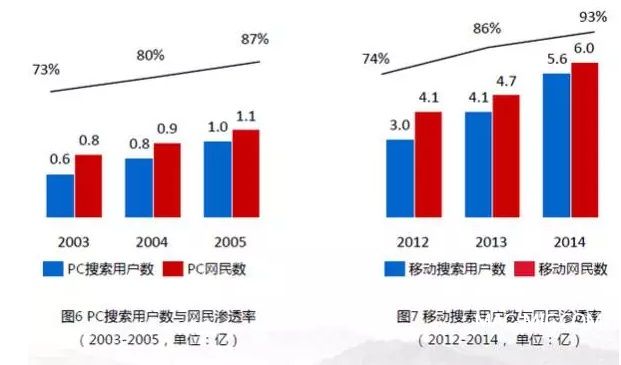 移動搜索的發(fā)展歷程與早期的PC很相似,不過移動搜索的發(fā)展更為快速。據(jù)百度2015年初發(fā)布的《移動互聯(lián)網(wǎng)發(fā)展趨勢報告》顯示,移動搜索已成為用戶規(guī)模僅次于社交通信的第二大應(yīng)用垂類,且移動用戶的搜索需求(人均搜索次數(shù))呈現(xiàn)穩(wěn)步提升趨勢。此外,百度移動搜索流量也已超過了PC搜索。