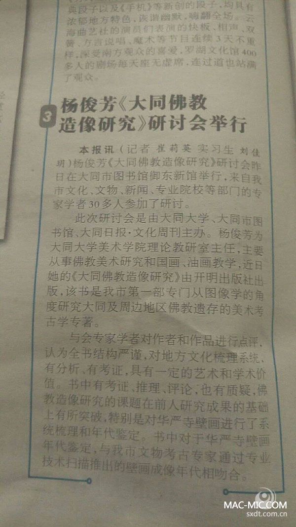 十年之功終成冊(cè),學(xué)術(shù)研究創(chuàng)新績(jī)。2018年1月7日,伴隨著大同入冬以來(lái)的第一場(chǎng)瑞雪,楊俊芳的學(xué)術(shù)專著《大同佛教造像研究》作品研討會(huì)在大同市圖書(shū)館召開(kāi),本次活動(dòng)由大同大學(xué)、大同市圖書(shū)館、大同日?qǐng)?bào)·文化周刊共同主辦。來(lái)自大同大學(xué)、大同市文化界、學(xué)術(shù)界的眾多專家、學(xué)者、作家40余人共聚一堂,就該作品進(jìn)行了研討。新大同網(wǎng)應(yīng)邀參加了本次會(huì)議。