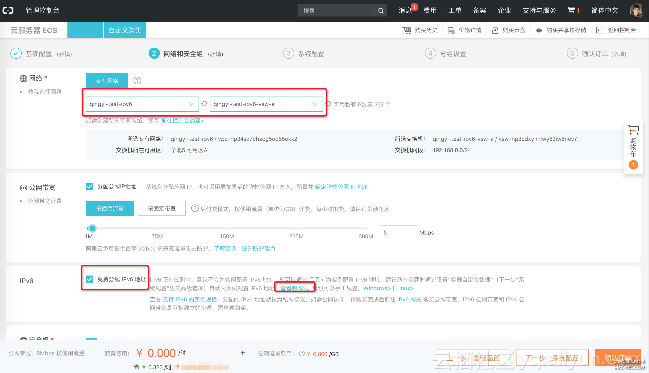 在第二步選擇剛創(chuàng)建好的 VPC / 交換機(jī),然后勾選 免費(fèi)分配 IPv6 地址,如下圖所示: