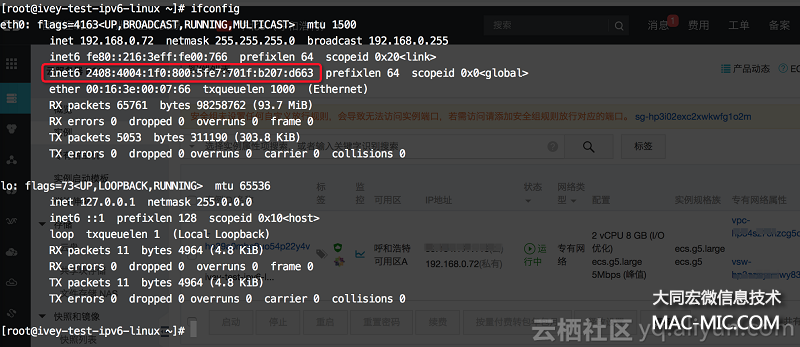 您可以通過(guò) IPv4 公網(wǎng) IP 登錄到機(jī)器上,ifconfig 查看 IPv6 地址,如下圖所示: