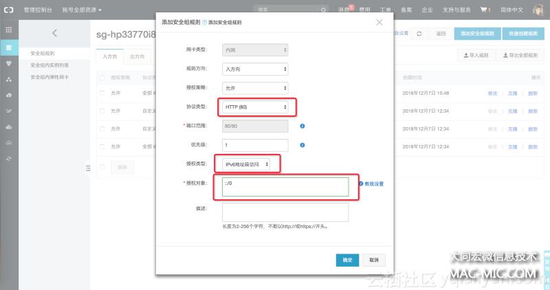 如果您的本機(jī)網(wǎng)絡(luò)支持 IPv6,可以為該實(shí)例 開(kāi)通 IPv6 網(wǎng)關(guān)公網(wǎng)帶寬,然后直接在本地瀏覽器里輸入 http://[your_ipv6_address] 即可訪(fǎng)問(wèn), 需要注意在該實(shí)例的安全組里配置 IPv6 入方向 80 端口。如下圖所示: