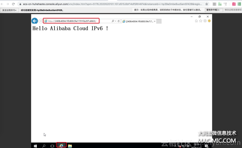 筆者由于本地網(wǎng)絡(luò)不支持 IPv6,因此又用上述步驟購(gòu)買(mǎi)了另一臺(tái) Windows 實(shí)例(配置好 IPv6),然后通過(guò) VNC(控制臺(tái)遠(yuǎn)程連接)連接該實(shí)例,然后通過(guò)瀏覽器訪(fǎng)問(wèn)上述第 7 步部署的 Web 服務(wù),如下圖所示: